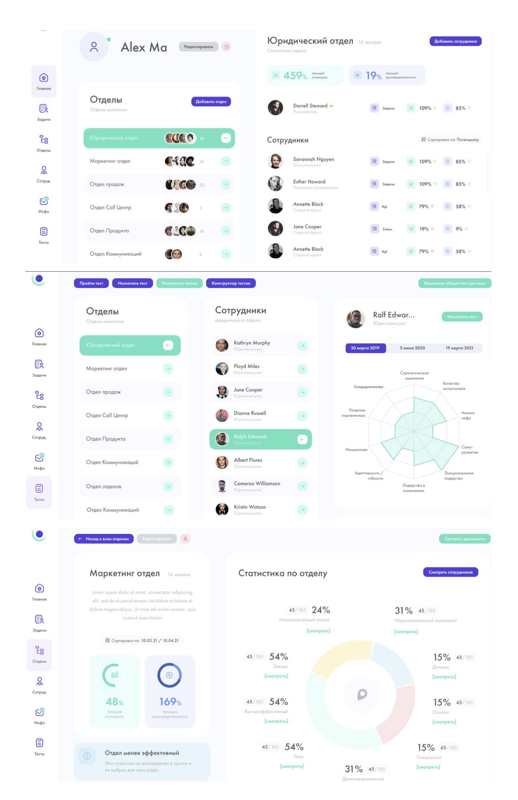 The application analyzes the productivity and efficiency of employees, a mechanism for testing employees has been introduced. The application implements integration with many services through the API.